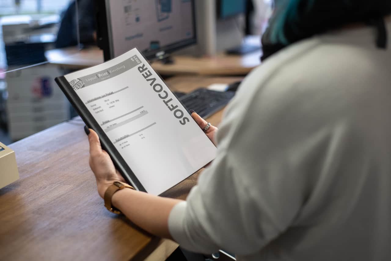 Das Aussehen der Softcoverbindung ist ähnlich der Leimbindung mit dem Vorteil, dass die Herstellung nur 5 Minuten dauert.
